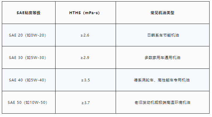 HTHS的單位是mPa·s(毫帕秒),數(shù)值越大,代表機(jī)油在高溫高壓下的油膜強(qiáng)度越高。根據(jù)行業(yè)標(biāo)準(zhǔn)(如SAE J300),不同SAE粘度等級(jí)對(duì)應(yīng)的HTHS最低要求如下: