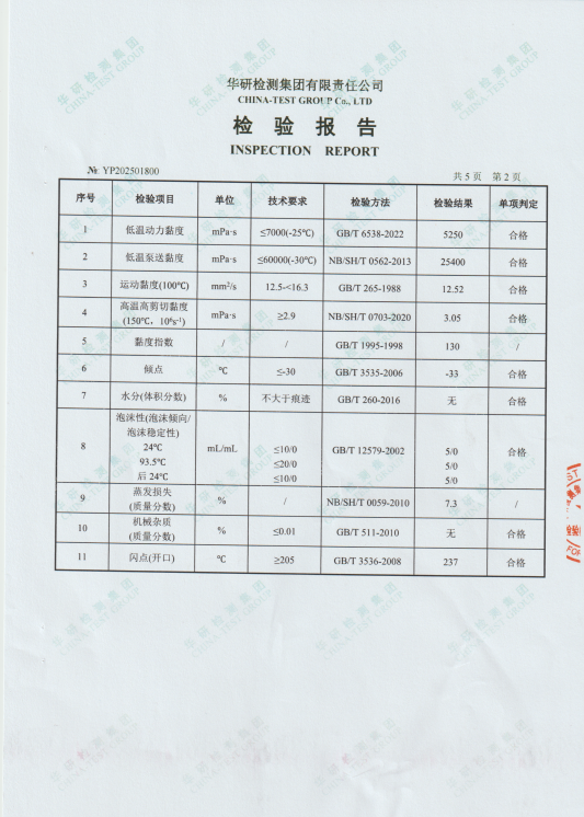 檢測環節由華研檢測集團嚴格按照國家標準執行,對低溫動力黏度、低溫泵送黏度、運動黏度、高溫高剪切黏度、傾點、蒸發損失、閃點等多項核心指標逐一核驗,最終出具的檢驗報告明確判定產品合格,權威性與公正性毋庸置疑。