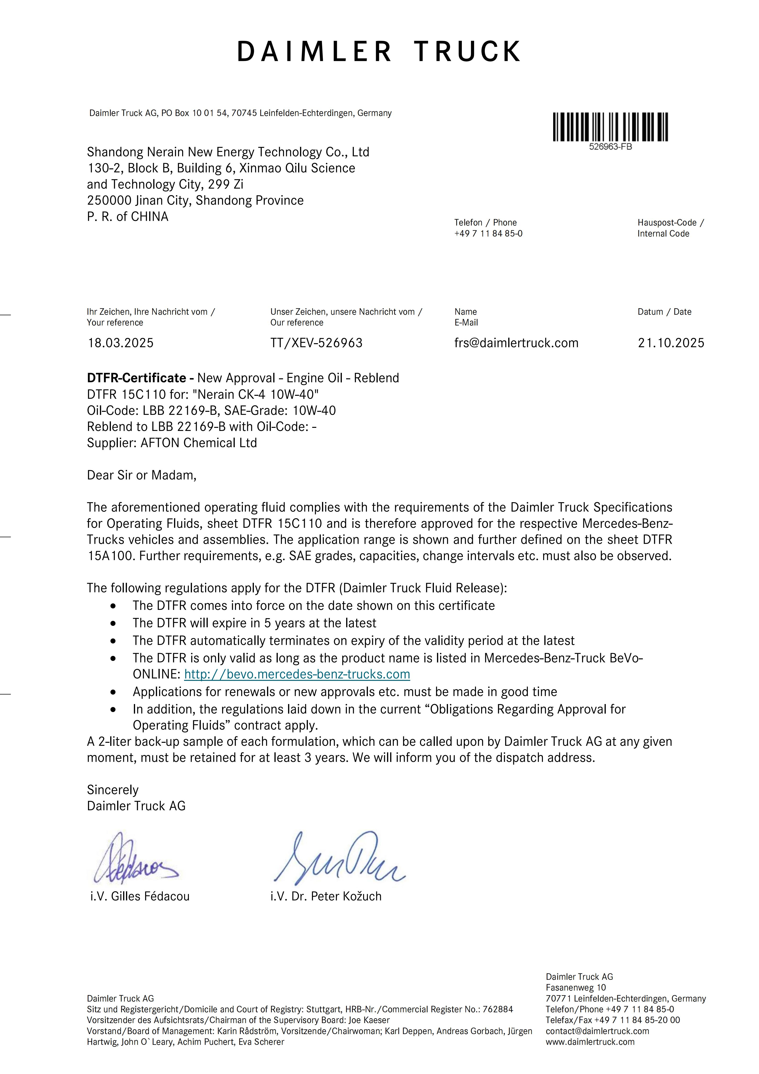 每一項(xiàng)認(rèn)證都是耐潤(rùn)潤(rùn)滑油產(chǎn)品贏得市場(chǎng)認(rèn)可的見證,通過(guò)戴姆勒 - 奔馳重卡15C110 認(rèn)證也是耐潤(rùn)在潤(rùn)滑油領(lǐng)域技術(shù)實(shí)力的體現(xiàn),是耐潤(rùn)潤(rùn)滑油對(duì)品質(zhì)承諾的堅(jiān)守與踐行。耐潤(rùn)潤(rùn)滑油將繼續(xù)努力,為全球客戶提供更優(yōu)質(zhì)的產(chǎn)品和服務(wù),共創(chuàng)美好未來(lái)!